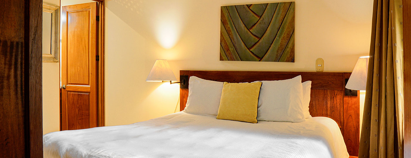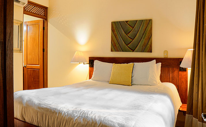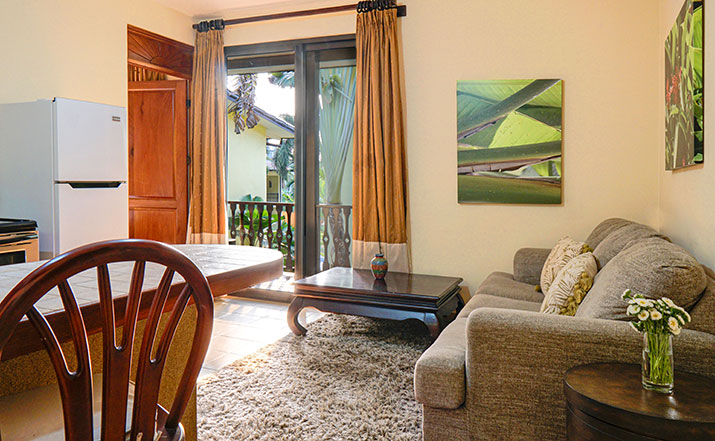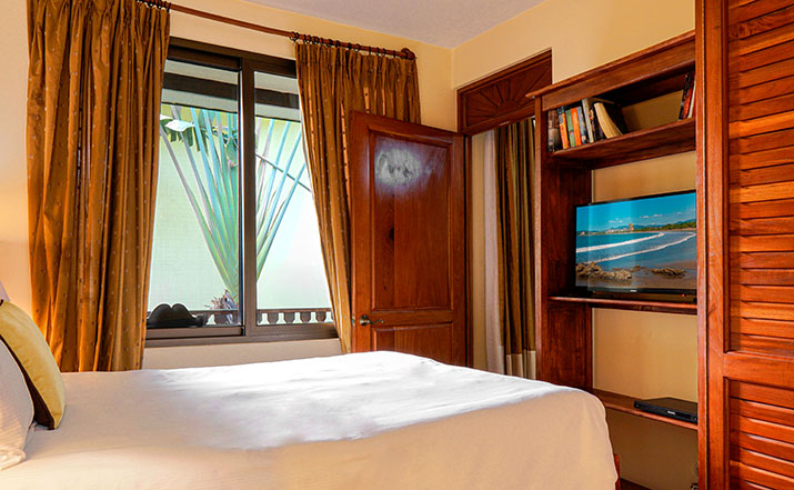 These luxurious two bedroom condominiums can accommodate up to six people. All condominiums are steps from the private swimming pool and waterfall. You will have an on-site office for check in/out, where we provide services for booking tours, transfers, fishing trips, and other activities. Daily maid service, full time maintenance, 24 hour security, cable TV, free wireless high speed Internet, and excellent air conditioning units. Kitchens are fully equipped for you to make your own meals and sit out on your private patio with your family dining. Washer and dryer units also are provided for your use. A Jenn-air BBQ grill is available at the pool-side area for our guests. Nestled in a beautifully lavished garden in the jungle within a small gated community of 17 gorgeous condominiums with 24 hour security. Best of all, the surfing beach is a block away from your front door.