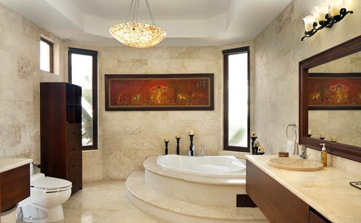 The villa features 4 spacious bedrooms each with a king size bed, flat screen TV and a private bathroom with unique designs in exotic natural stones. The master suite bathroom also has a jetted tub.
